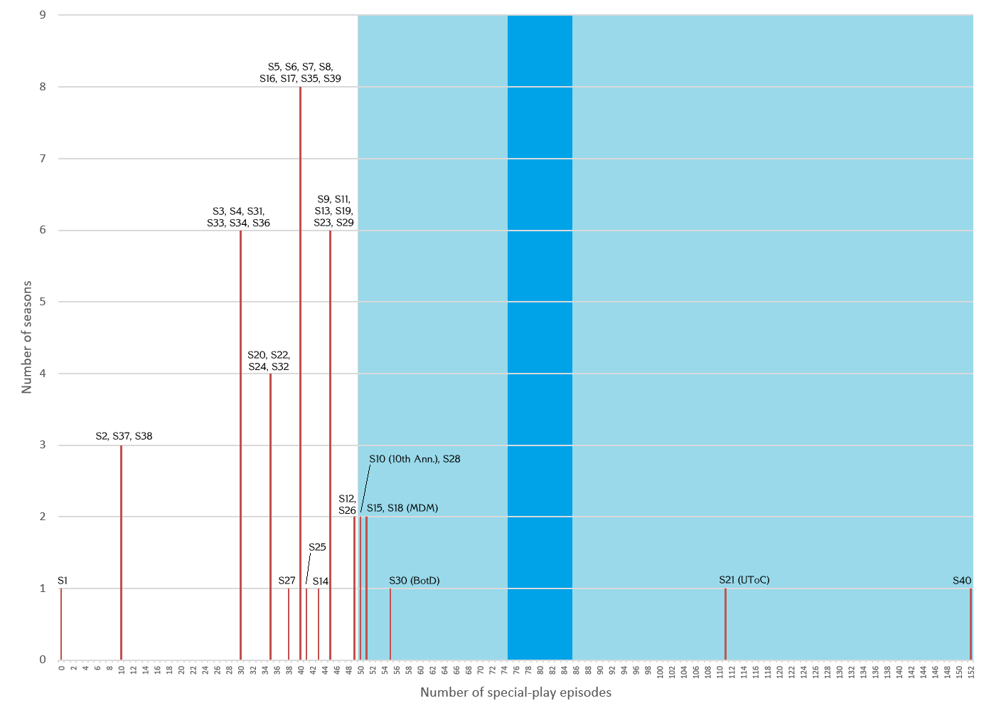 I feel fairly certain of that. I’ve updated the “blue histogram” I originally created a year ago to include the final special-play game count for Season 40, and I moved the dark blue range five games to the right (from 70-80, to 75-85; this is intended to represent the expected amount of special play in future seasons).